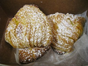 Any good Italian sb knows what a sfogliatelle is, but in case you are not of the Neapolitan ilk, I’ll explain. Sfogliatelle (or “sfoie”) are shell shaped pastry stuffed with a mixture of ricotta, cinnamon, and citrus (orange or lemon) as filling. The pastry texture resembles leaves stacked on top of one another (the word “sfogliatelle” means “many layers” or “many leaves”). Sfoie originated in a monastery in Salerno, Italian, in the 17th century- leave it to the monks to create something so profligate meant to be eaten for breakfast, of all meals. They are crispy on the outside, almost chewy on the inside, and possess the power to revive someone who has already been pronounced DOA.