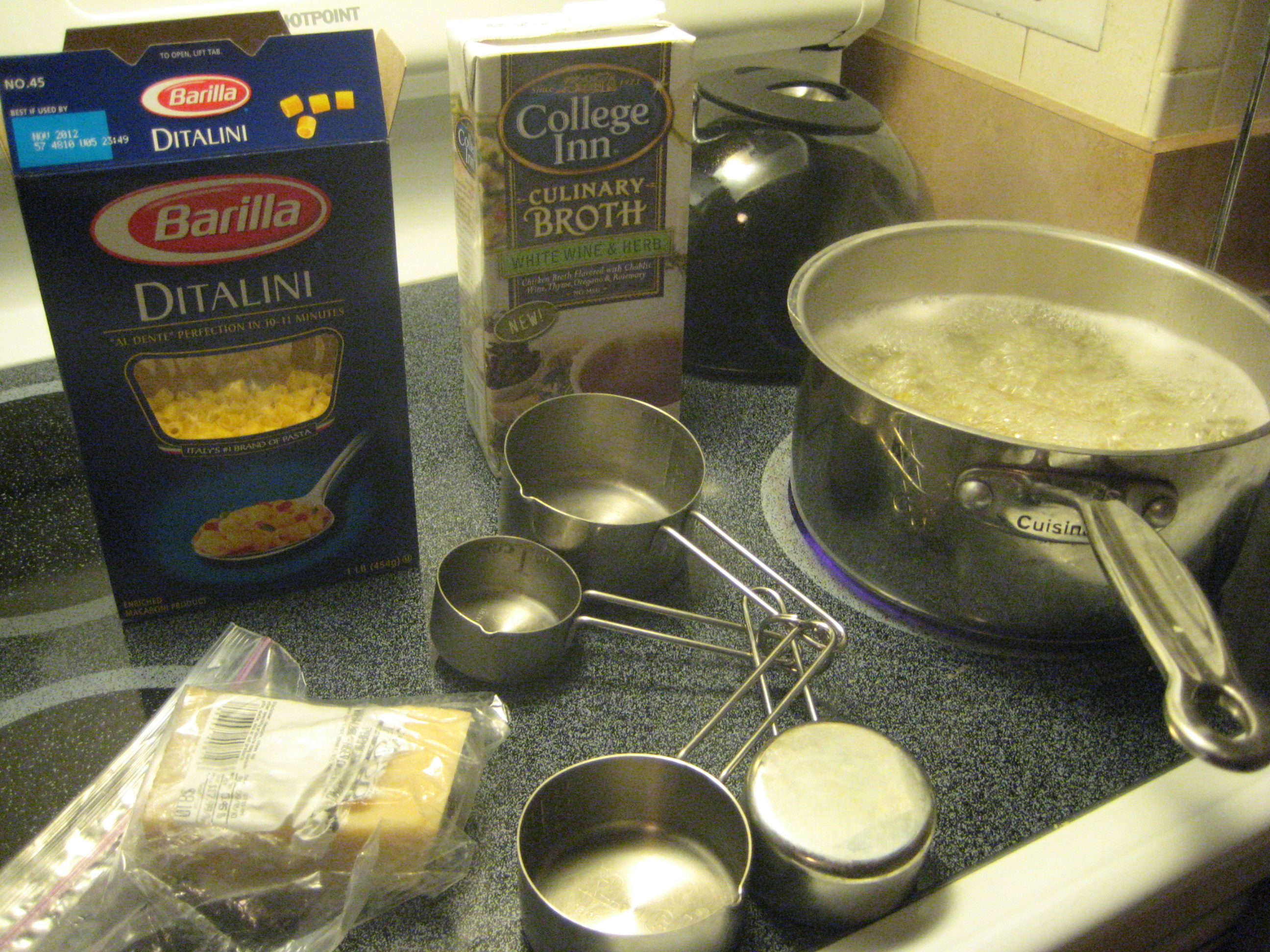 Boil water. Cook pasta. Put pasta in broth. Add lemon juice if you want. Dump liberal amounts of cheese into bowl. Add more cheese. Stir. Eat.