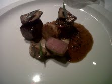 Next, I chose Torchon of Foie Gras de Canard with ginger, monbazillac gelée, and compressed plums.  There was a moment, about half way through, when I thought: I should have gotten something lighter-  the Shetland Salmon Chaud-Froid sitting across from me was probably the wiser choice to start this meal. But I got over it. Topped with sea salt and served with house-made brioche, the foie gras was smooth, indulgent, and nicely complemented by the ginger.