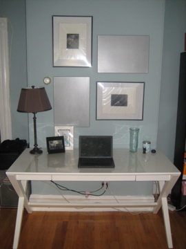 I know, I know, I said that if you write you should be able to write anywhere. But there is something awfully tantalizing about a new desk, a fresh coat of paint, and cork boards just dying to be filled up with pictures and ideas. The trillium photos, one of my favorite gifts, don’t hurt either. Unfortunately I still need a proper chair, which brings me to…