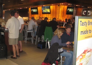 And finally, should you be unlucky enough to be stuck in the alternate universe for the long haul- missed flight, weather delay, catastrophic business trip- you’ll be visiting the airport bar. Really, it’s the only option if you need something to make you feel better about your impending night on the floor of the terminal, or crunched into one of the fake leather seats. Belly up and make friends, everyone is there for the same reason. And at least you can watch sports in the bar, giving yourself a break from that same CNN human interest piece that has been droning on and on in a loop for two hours. The bar probably has fries, wings, or some kind of comfort food that will soak up the vodka.