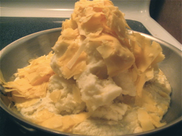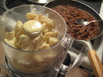 While this is simmering, peel and cut potatoes, add to a pot of water. Salt your water, bring to a boil, then simmer until potatoes are tender- about 10-15 minutes. If you time this correctly, the potatoes and the celeriac should be done within minutes of one another.