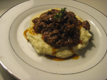 Pile on plate. Spoon leftover short ribs over potatoes.