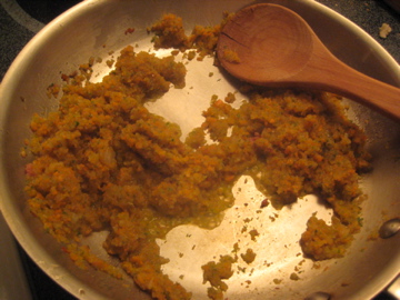 Remove sausage from pan (leaving the drippings), and add vegetable puree. Cook puree for 5-10 minutes on medium-low heat, until most of the water from the celery has cooked off.