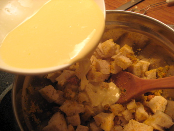 Whisk the chicken stock, cream, and egg together, then add to the bread mixture and fold in. Season with salt and pepper