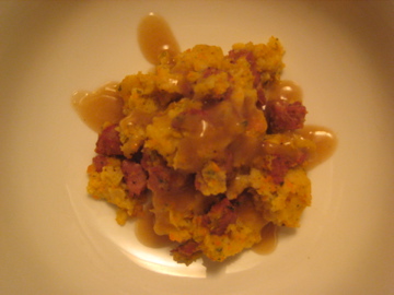 But when you look at enough recipes, for both stuffing and dressing, it becomes clear that the real difference is an egg and some cream- dressing is savory bread pudding. All my life I’ve never had a stuffing baked in an egg and cream mixture, but almost every dressing recipe I found contained these two things. And well, I had to try it, if only to find out whether or not I am as picky about dressing as I am about stuffing. I made the below recipe last night, and I have to say, it was delicious. I can’t emphasize the bread pudding aspect enough- parts of this were almost custard-like. I would never have referred to stuffing as decadent or creamy, but this dressing was both.
