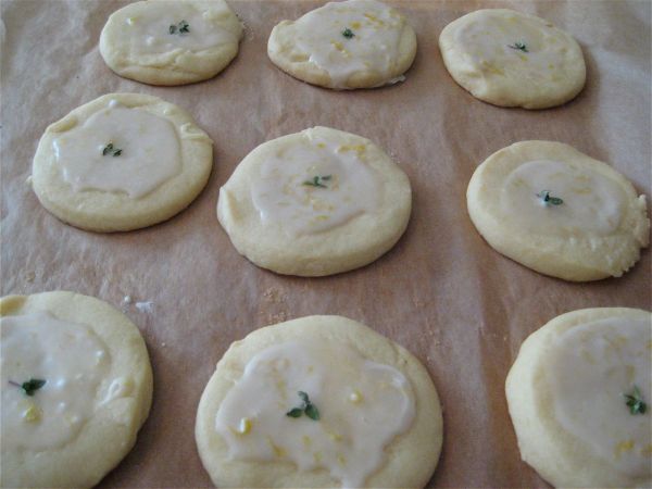 I chose shortbread cookies, whose only ingredients are flour, salt, butter, and confectioner’s sugar. I mixed together the dough, but going through my cabinets I decided to include almond extract and rosewater for flavoring. For the glaze, I mixed lemon juice into the sugar instead of milk, and added some lemon peel. After icing, I even got a little whimsical and put thyme leaves in the middle of each cookie.