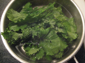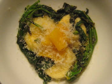 Put drained rapini and squash into sauce and toss, then pour over your ravioli. Arrange into a heart shape, if you are so inclined. Top with parmesan cheese.