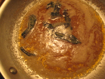 Melt butter over medium-low heat, then continue cooking until it becomes golden brown. Even under med-low heat, this will only take a few minutes, so be careful to keep a close watch. You want browned butter, not burned butter. Remove the pan from heat and add the sage leaves (whole), then add your lemon juice. The lemon is really just to brighten the sauce a bit- too much and it becomes bitter, so if you are worried, add the juice a little at the time and taste as you go.