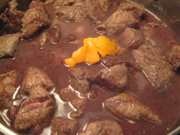 Add wine to the pan and deglaze for several minutes, until wine is simmering. Then add beef broth, thyme, bay leaves, garlic (smash the cloves with the back of your knife and add whole, they will fall apart as they cook), orange zest, and tomato paste. Stir, then add beef back to pan. Simmer uncovered for 15 minutes, then cover and simmer for 2 hours.