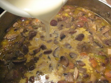 In another large pot, melt the butter and add your leeks. Saute until leeks are soft (about 10 minutes) then add mushrooms and cook until tender. Add 1/4 cup of flour and stir just until incorporated – you will have what looks like mushroom goo in your pan.