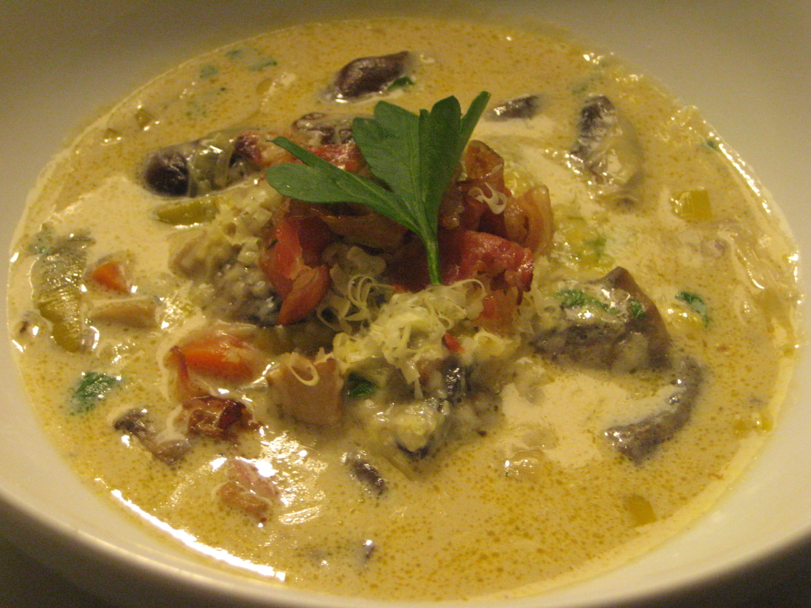 The best mushroom soup I’ve ever eaten lives at The Cafe at the Frick in Pittsburgh, PA, years ago. I remember that it was a stock based soup, with just a tiny bit of cream, and that it had capers. It was amazing, and every time I go back to the Frick I hope they have it on the menu.
