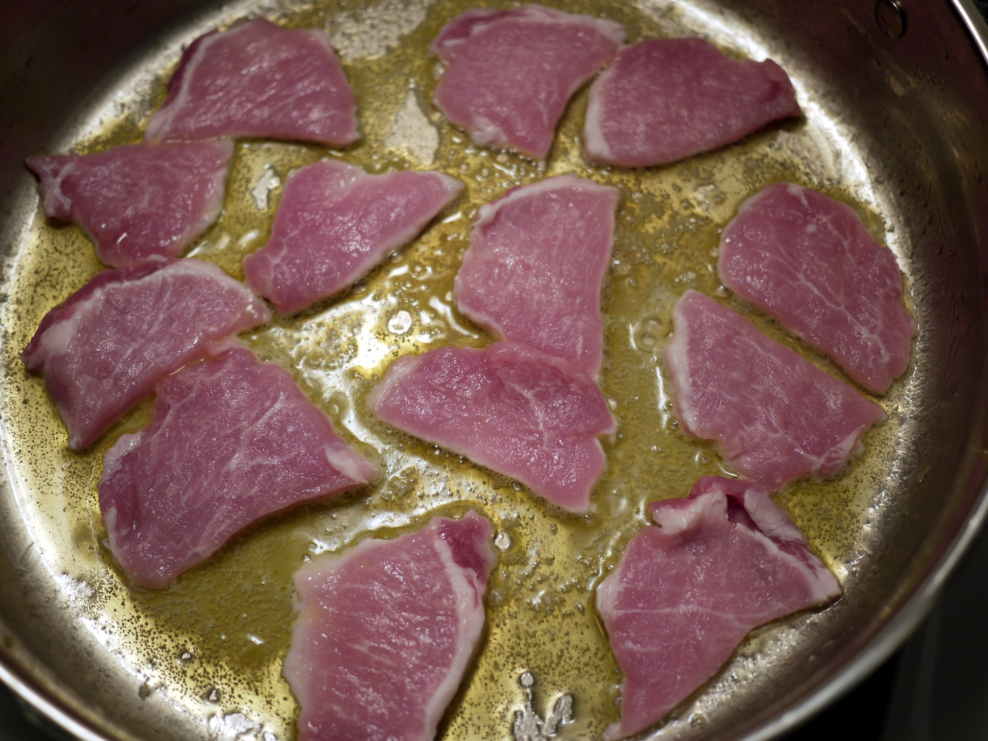 Start by going to your butcher and requesting thinly sliced pork loin- one of the tricks to this dish is getting pork so thin it doesn’t take long to cook.