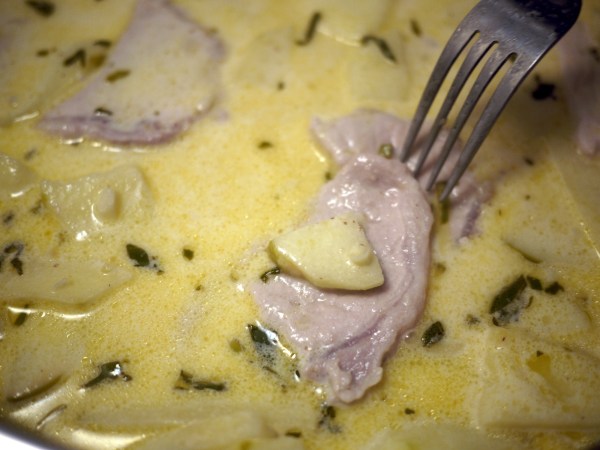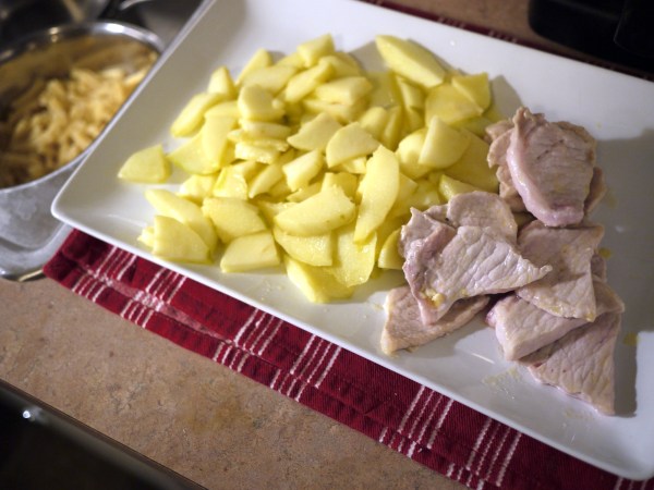 Cook your pasta, then leave it to drain – you’ll add it to the sauce and warm it up later. Peel and core your apples, then slice to a similar thickness as your pork. Melt half of your butter in a large pan and saute the apples over medium-low heat until tender but not mushy- about 8 minutes. Remove apples from pan and put on a plate to rest. Using the same pan, melt the rest of the butter and sear your pork slices, about a minute on each side. Leave butter and pork juices in pan, but remove pork and set on a plate, covered in foil, to rest while you make your sauce.