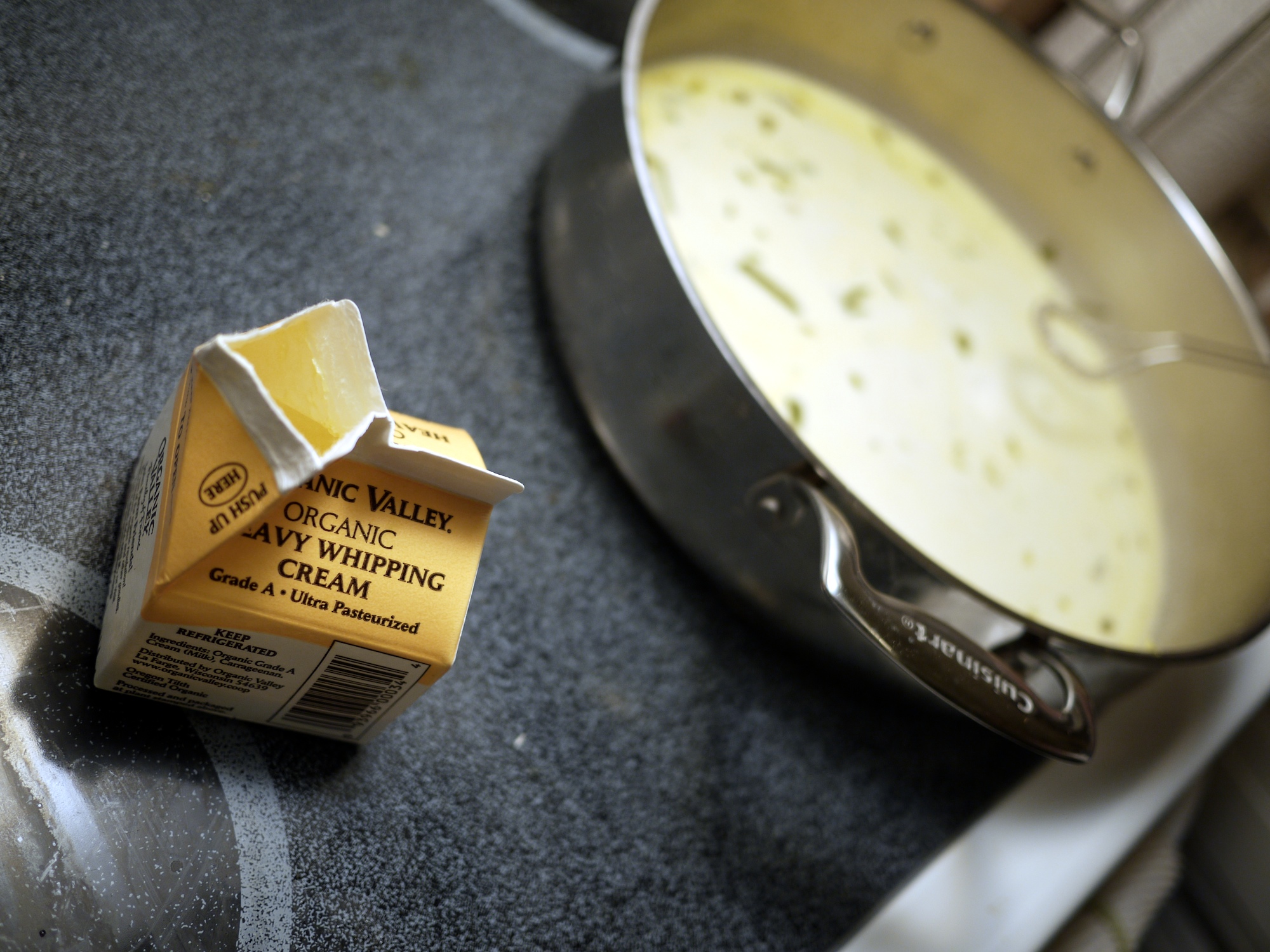 Add cider to pan and stir, scraping bottom of pan. Then add minced garlic, sage, salt, pepper, mustard, and chicken broth. Using a whisk, incorporate all ingredients and bring to a boil. Turn down to a simmer for 10-15 minutes and let mixture reduce. Add cream, bring to a boil, then let simmer for 10 minutes. Taste, adjust salt and pepper if needed.