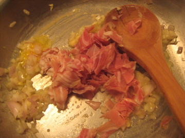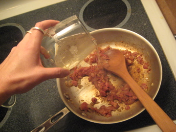 Then I was in my fridge looking for the tomatoes when I ran across some leftover pancetta. I really hate to waste food, and I couldn’t think of another immediate use for the pancetta, so, for the good of my conscience, I chopped it up and threw it in. There are people starving all over the world, you know.