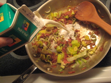 Then, I had to go back into the fridge for the leeks, and I spied the leftover half and half I had used for something earlier in the week. I don’t use half and half on a regular basis – I take my coffee black -and again, I really hate to waste food. I just feel that it is socially irresponsible. So in went the half and half.