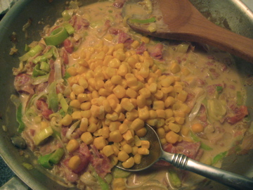 Sometimes I flip through Cooking Light and think, hey, that looks like a really nice healthy recipe. And so I buy some ingredients and set about to cook my dinner. I always start with the very best intentions, as I did again recently with my plans to make a pasta dish with a sauce of corn, leeks, chicken broth, lemon juice, garlic, shallots, and light olive oil. It sounded delicious- a nice respite from the diet of short ribs and stuffing I’ve been indulging in lately.