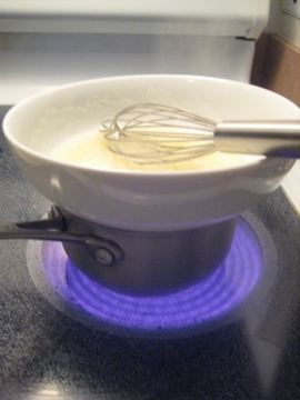 The instructions were to mix egg whites and sugar into a slurry and then heat, while whisking, over simmering water. I really, really thought I had performed this task perfectly, but the finished icing was nowhere near as sweet, nor as delightfully crispy as those from the cupcakes I buy and devour at Flour. Sigh.
