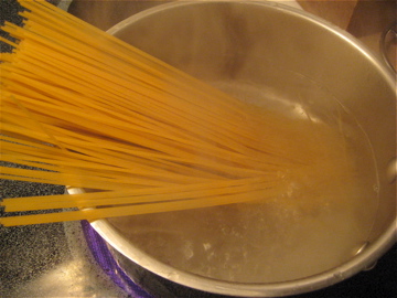 Liberally salt boiling water before adding pasta, cook for 8 minutes (or until al dente). Before draining pasta, reserve 1 1/2 cups of cooking liquid. Drain pasta and set aside.