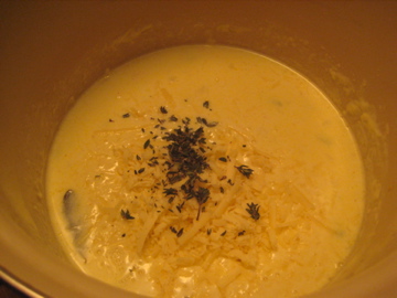 Remove from heat, add cayenne, bacon drippings, and sherry, stir. Whisk in cheese and thyme, season with salt and pepper. Serve in a bowl, topped with bacon, tomato, and toasted baguette slice. Sprinkle with cheese – Red Dragon if you have it, plain cheddar if you don’t.