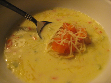 The few times I’ve had cheese soup, I’ve been sorely disappointed. It usually takes the form of slightly thinner cheese whiz, with that unnatural orange hue and sticky consistency. Sometimes the soup has unidentifiable food particles suspended in its gelatinous structure, but usually it seems best not to analyze the bits too closely. To avoid these problems, I consulted several different recipes – and paid special attention to pictures – before attempting to create my own Cheddar Soup. I wanted something lighter in texture, more like a broth and less like traditional cheese glop, so I tossed out any recipe that used heavy cream. I also didn’t want the flavor to be of just cheese, so I paid special attention to formulas that used things like liquor or beer.