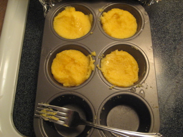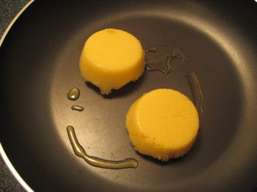 Prepare one box of instant polenta and season with salt and pepper (or however you would like), spoon into muffin tin (do not use muffin cups or plastic wrap). You can store this over night if you are using this as a leftover polenta meal, or just cool for 30 minutes.