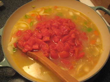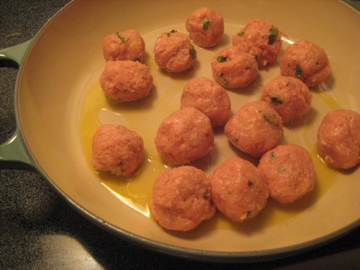 So I took some liberties with that part of the recipe – in keeping with the “healthy” theme, I used ground turkey- I just couldn’t bring myself to use chicken. I used Italian breadcrumbs instead of pesto, and I put an egg and some fresh chopped parsley in the mix. I pan-fried the meatballs in my new Le Creuset braiser (happy birthday to me!), and cooked them the rest of the way in the soup. They were not the best meatballs I’ve ever made, but they were quick and healthier than my normal pork/veal/beef mixture.