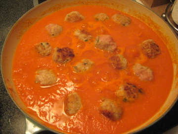 After a particularly arduous week (which you know has been tough when you’re using “week” to describe just Monday, Tuesday, and Wednesday) I don’t always feel like making something complicated, and I sometimes resort to ditalini. But last night I found a new comfort favorite, a recipe in America’s Test Kitchen for Tomato Soup with Meatballs and Pasta. The recipe was in an issue focusing on “Light and Healthy” recipes- this meant the meatballs were supposed to be made of ground chicken mixed with just a few tablespoons of pesto, and poached instead of cooked with oil.