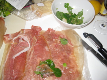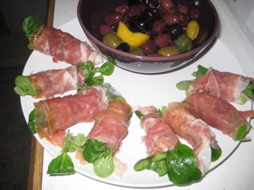 I like salad, but I especially like it when it’s wrapped in meat. And I especially like it when that meat is prosciutto. An easy appetizer combines both greens and this salty meat, and doesn’t take long to make. If mache isn’t available, you can substitute arugula or mixed greens, but don’t use iceberg or romaine- too unwieldy and not enough flavor for this dish.