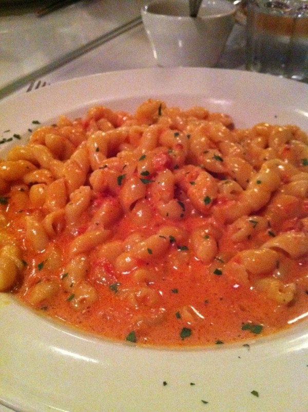 Eh, I wanted pasta anyway. And when I found out that they not only had red sauce, they had PINK sauce, well, forget it. Homemade fusilli with pink sauce, please, but not before starting with Arancini. Their risotto balls had the perfect gluey consistency of ghetto Italian food, rife with peas and sitting atop Vinny’s (actually quite refined) red sauce. The pasta arrived in massive quantities, and while I wouldn’t call the price “cheap,” the homemade noodles were absolutely worth it.
