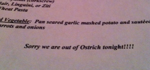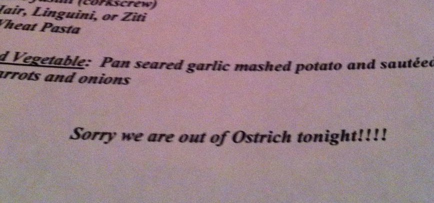 -“Reasonable, if not inexpensive prices. Did I mention they have ostrich, and rabbit?”