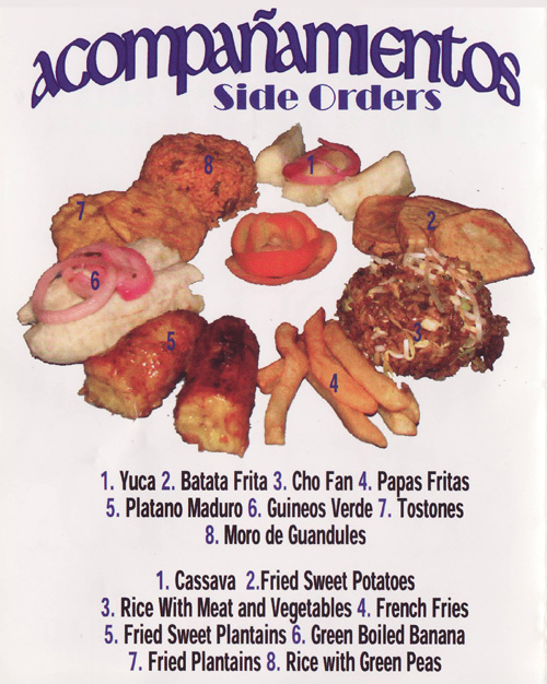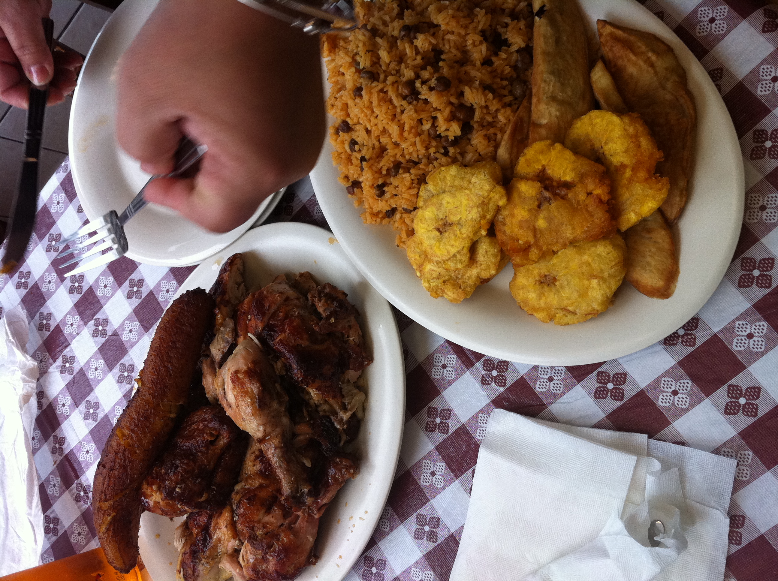 The chicken was plucked from a row of birds waiting in a metal cage, and sectioned as we waited. My friend ordered the accompaniments: batata, yucca, platano maduro, and tostones (see menu chart below). They were all delicious, but my favorites were the yucca and the batata- both fried perfectly, and not greasy.