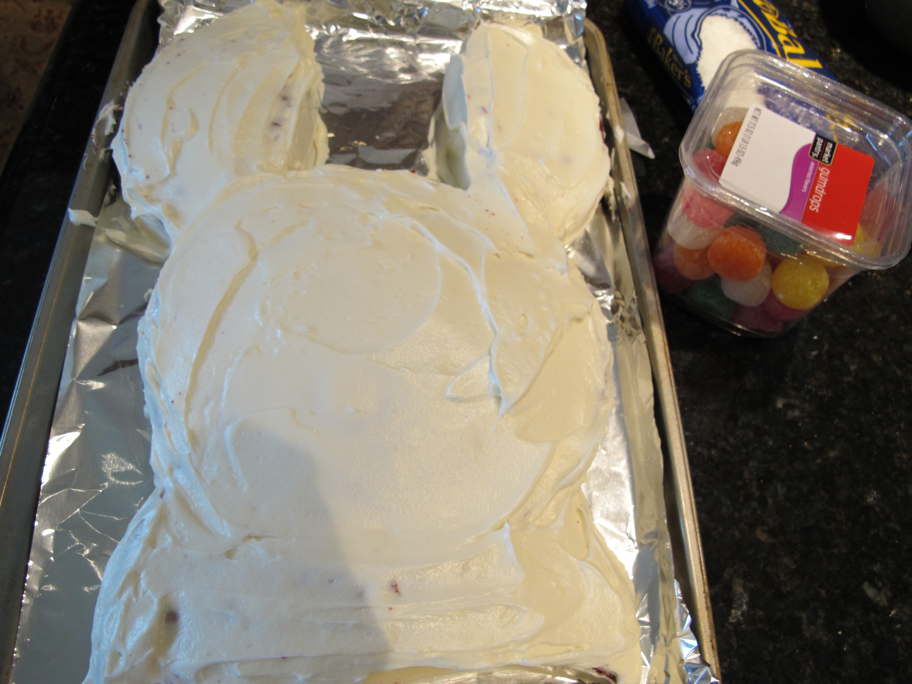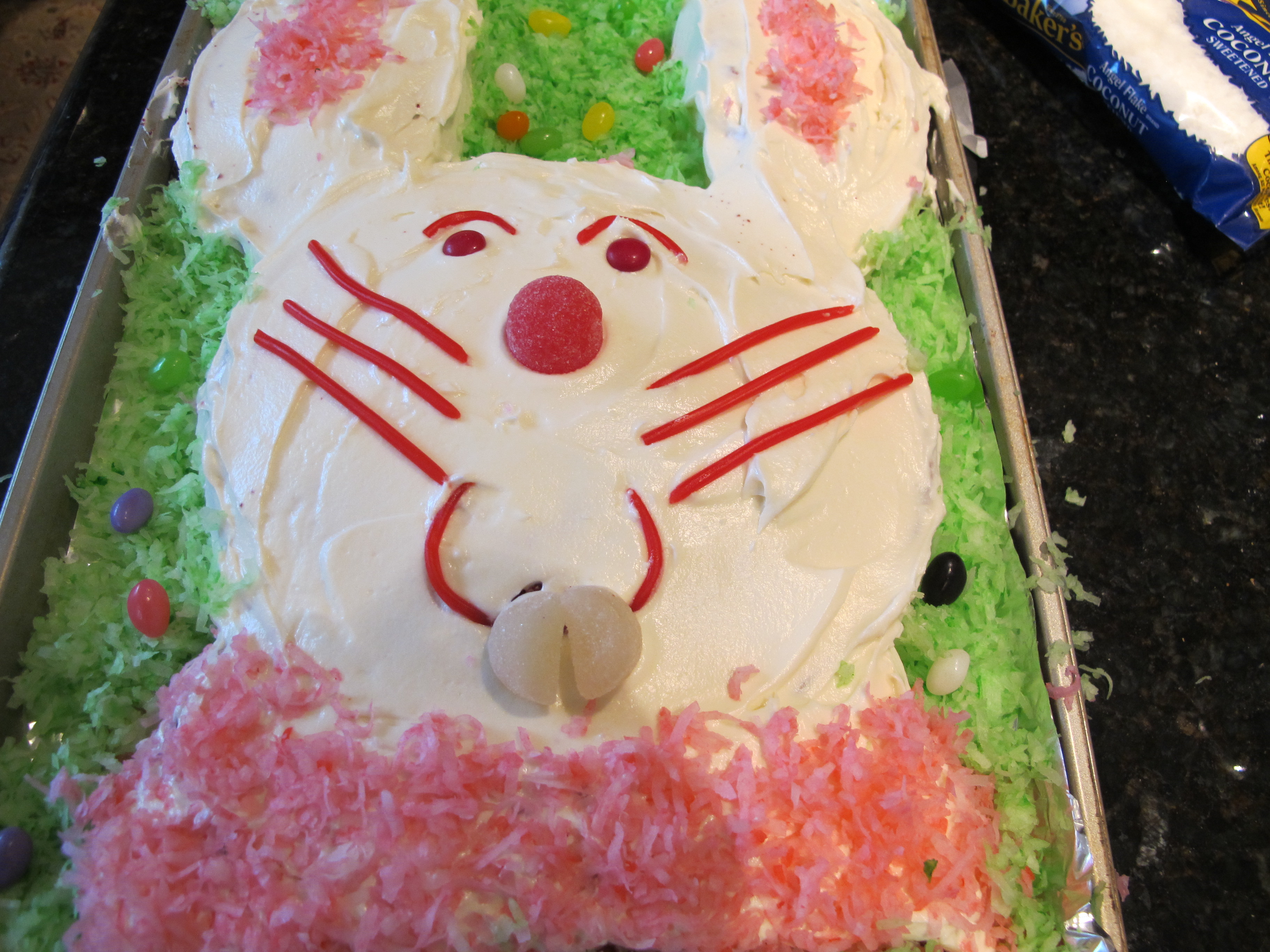 Start with two round cake layers, whatever flavor you like. One cake will be the bunny head, and be left untouched. The other cake will be cut into ears and a bow tie, because no self-respecting Easter Bunny is without a bow tie.