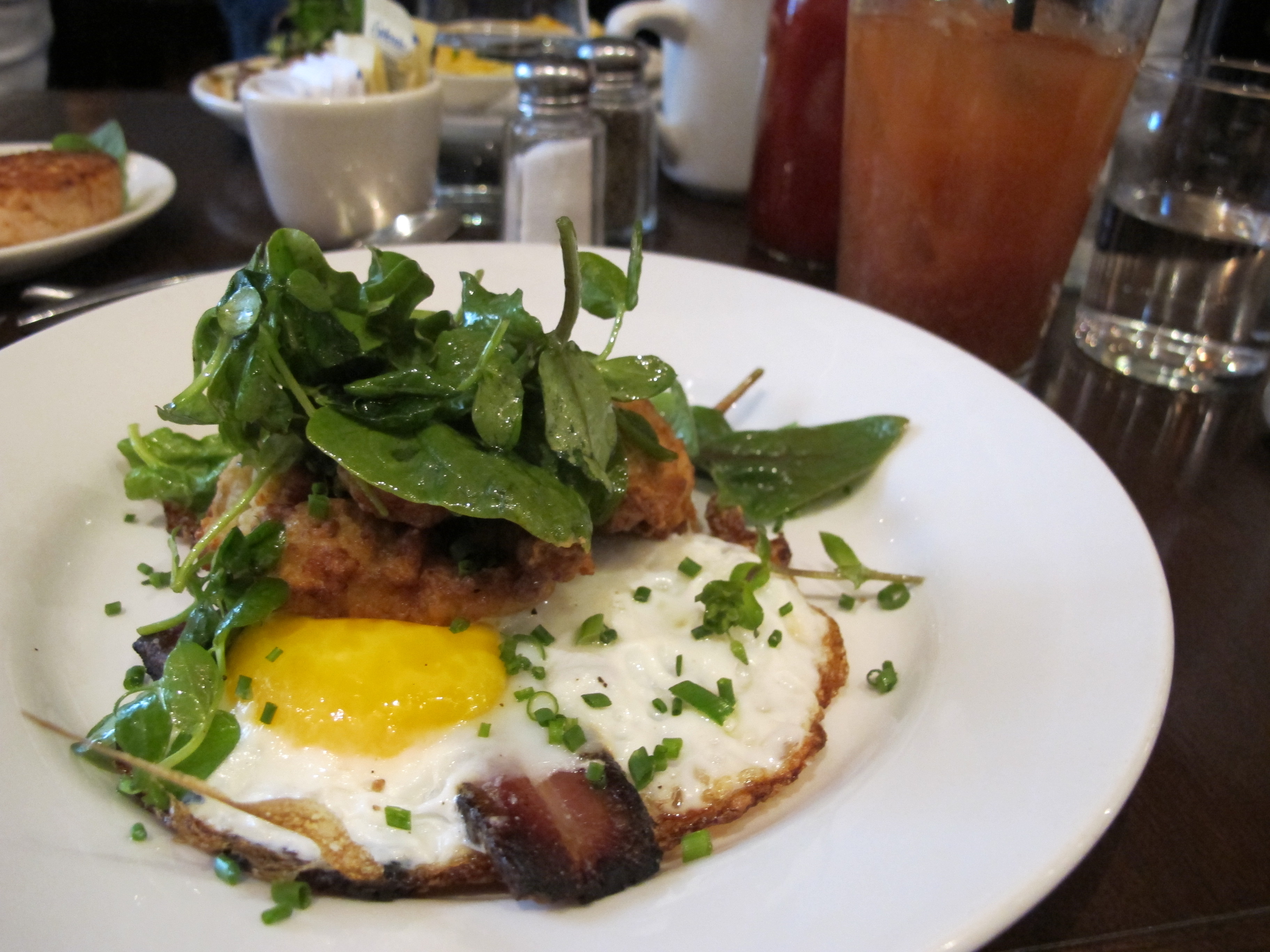 But I want to talk about brunch, and what is brunch without a Bloody Mary? Start with a tutorial on The Gallows’ options: Simple (traditional), Eric the Red (with Aquavit), or Out Of Control (no bloody, emphasis on the mary). I played it safe with a “Simple,” served with pickled vegetables and plenty of horseradish. Like most of their food, this drink had a fresh, clean flavor. Tomato-based drinks can tend to take on a muddy taste, but this was very crisp.