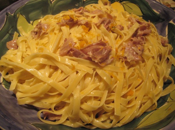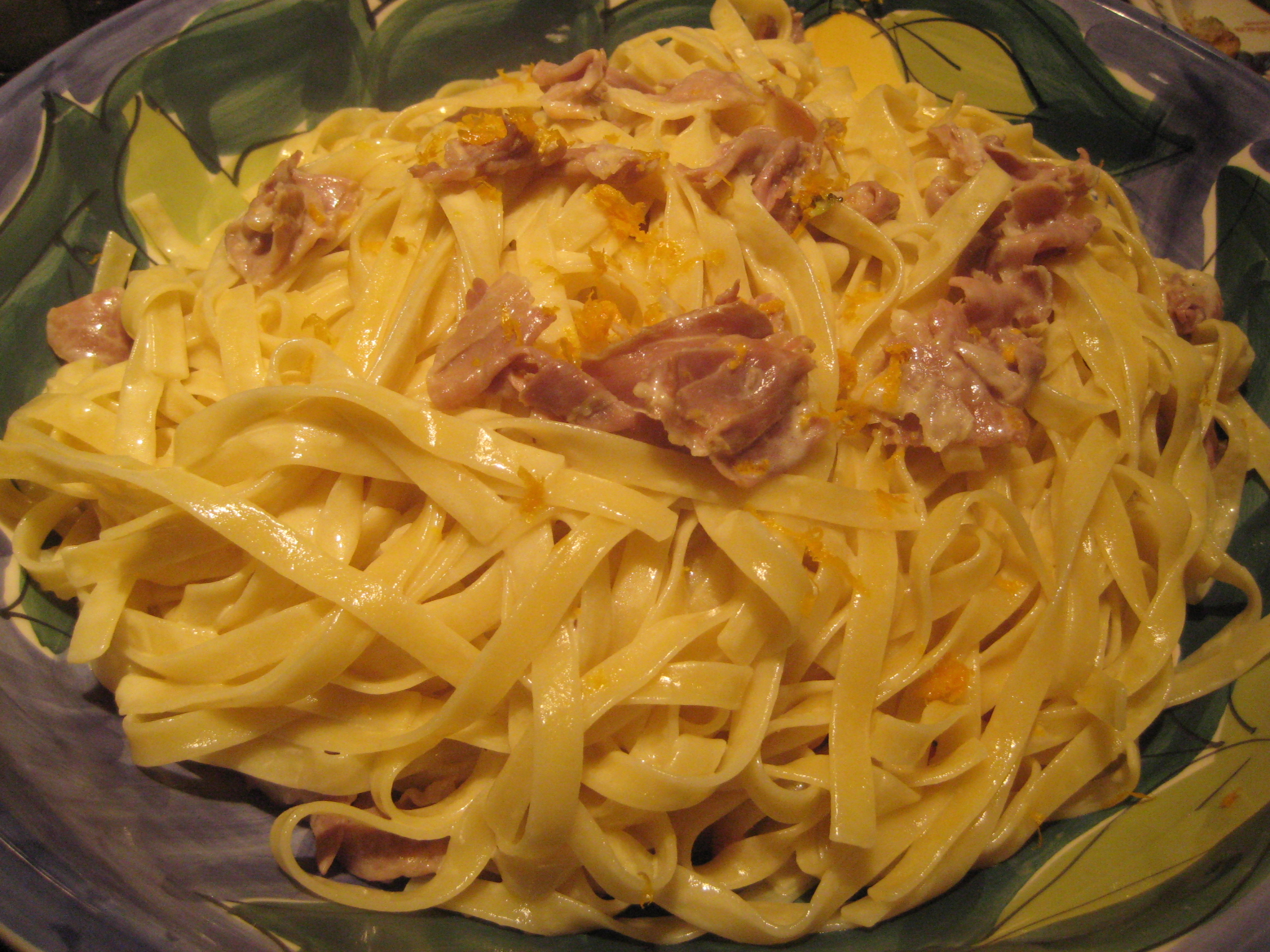 I’m a big fan of lemon-based sauces, but had never experimented with orange until I saw this recipe from the Italian issue of Bon Appetit: Tagliatelle with Prosciutto and Orange. I’m a sucker for any edition of any publication that features Italian food, but I’m usually disappointed in the recipes – they always seem to be the same. This was a rare example of a new take on pasta – something different than red sauce, white sauce, meat sauce, or clam sauce.
