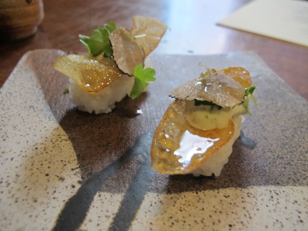 Try not to miss the door either, relatively hidden down a small side street in Boston’s leather district. Just a block from Les Zygomates and Sorriso, the view from o ya’s counter is a dingy brick alley, but the restaurant is anything but shabby. And, as our waiter pointed out, there is a lot of reading involved in a meal here. The menu is tapas style, which for sushi translates to 2-3 bites on each plate, so you’ll have to wade through the long list of options to get your fill. Or, you could take the lazy way out and get the tasting menu. We were lazy.