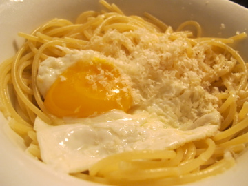 Boil pasta water, add pasta. Immediately start cooking your “sauce”: In a medium saucepan (non stick is probably best here), cook garlic in oil over medium-low heat, making sure not to burn it. Remove garlic from pan, discard – leave oil in the pan, over medium heat. At this point your pasta should be done- drain it quickly and return to pot – but OFF the heat. Add eggs to oil and cook carefully until whites are just solidified – about 1 minute. Quickly stir eggs and oil into the pasta, breaking up the yolks and white. Add cheese, salt, and pepper to taste. Add parsley or lemon juice if desired.Voila!