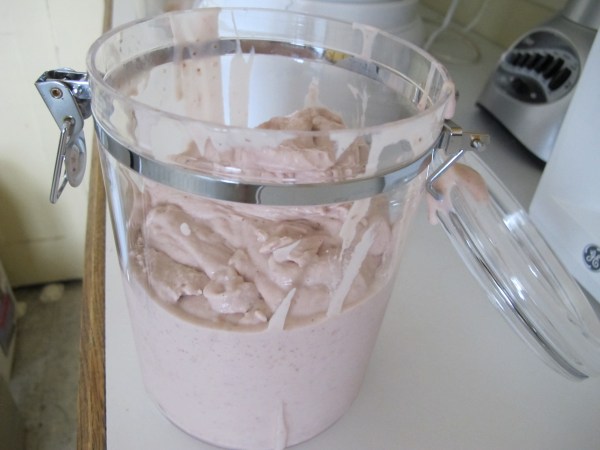 When researching recipes, I came across many that used both milk and cream, and a few that used half and half. While it seems like the combined effect should be the same, after trial and error it is clear that half and half is the way to go. In addition, recipes that call for more than 6 egg yolks are excessive. The recipe below is based on Emeril’s notes for Strawberry ice cream, but I reduced the number of eggs, added balsamic vinegar, and did a lot more whisking than the recipe called for. The result had a rich berry flavor with a little tang – the vinegar wasn’t overly apparent, but you could tell something was in there. Voila.