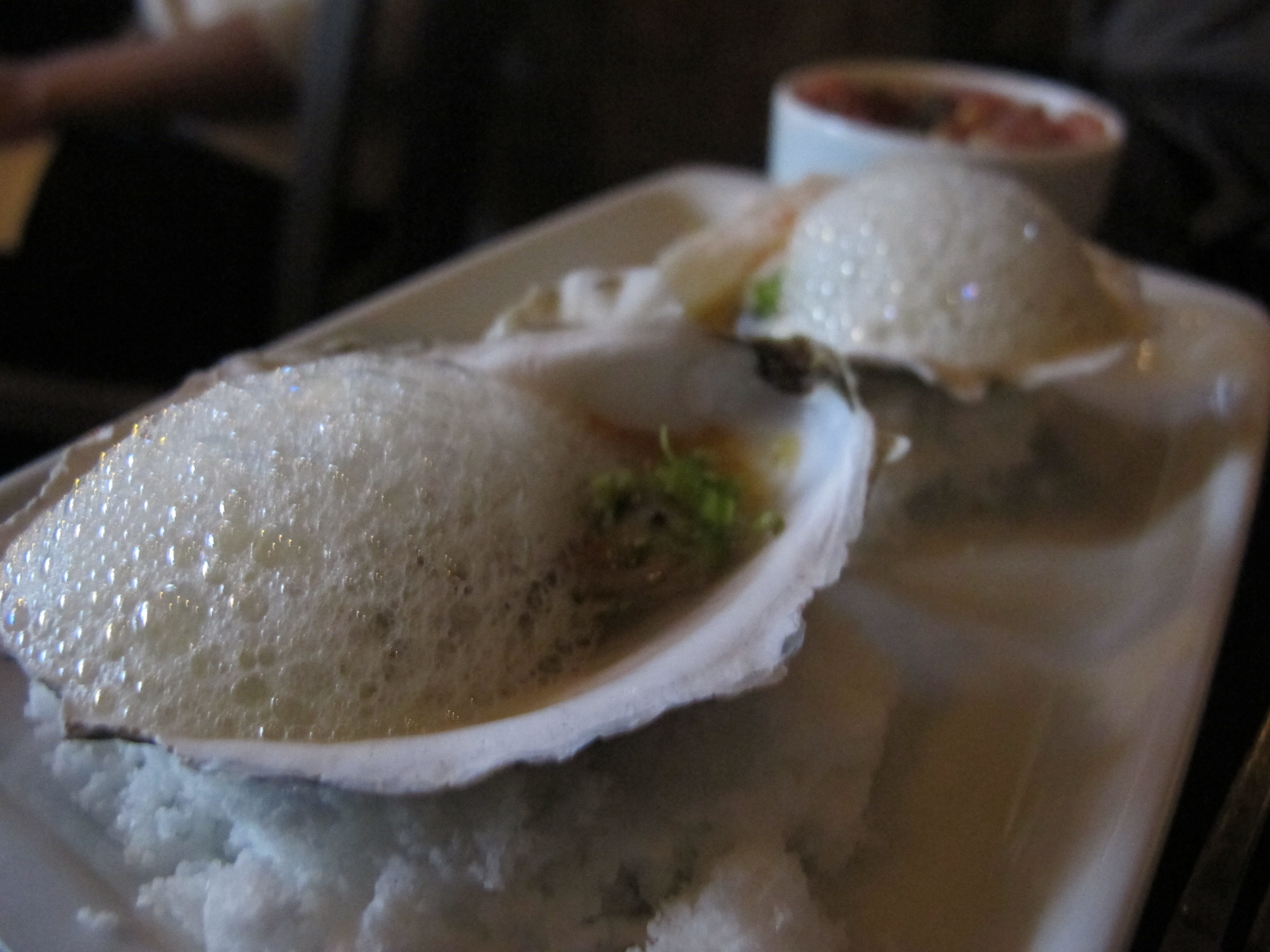 For our pinchos we chose the tuna tartare with charred spring onions and pine nuts and the foie gras with grilled peaches. The tuna was lush and the pine nuts made a nice flavor and texture contrast, as did the peaches with the foie. For tapas we started with Ostras en Escabeche – marinated oysters with grains of paradise, lovage, and citrus. One slippery mouthful each, but a perfect match of vinegar brine and bright acid. Next were Anna’s Empanadas, which would have been perfect had our plate not been whisked away with several bites left on it. It was at this point that I started to feel a real time pressure to my meal – if I didn’t jealously guard every mouthful (and race to finish my food) I’d lose it to the well-intentioned but rushed waitstaff.