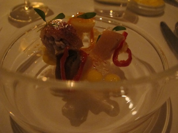7. Mimolette – Royal Blenheim Apricot Membrillo, Fennel Bulb, Nicoise olive paste, Pine Nuts and Sorrel. I was prepared to be disappointed by the cheese course, as I know Mimolette and have never been excited by its fairly bland flavor. However, this had been aged well, and accompaniments brought out flavor I never knew existed. I wish I could have bought a block of the membrillo and a jar of the olive paste.