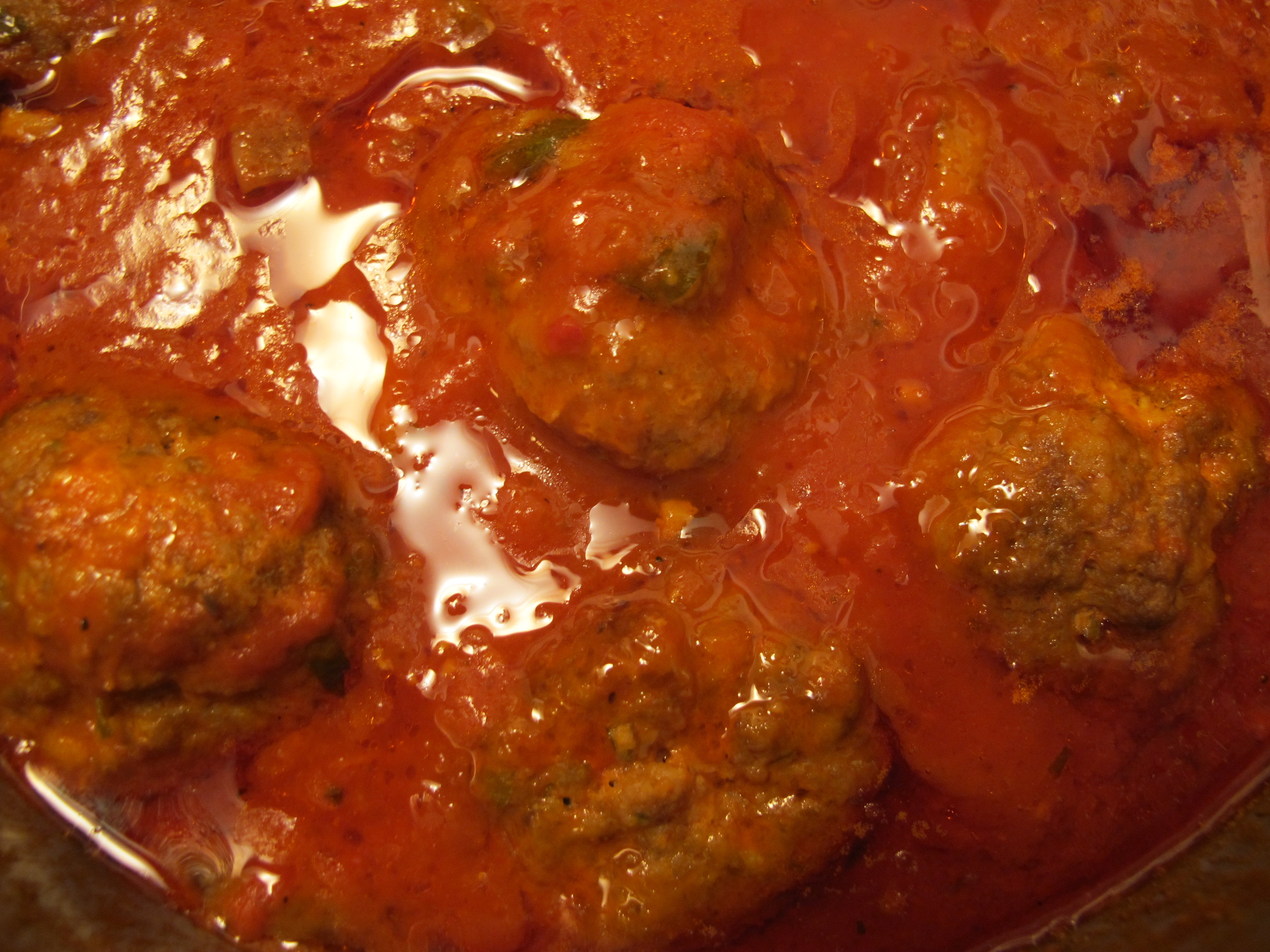 Form into balls and place in a glass baking dish. Drizzle with olive oil and bake at 350 for 15 minutes.When you remove the meatballs from the oven, they will be lightly browned and technically ready to eat (you should try one at this point, just to be sure). But the final step is a nice hot bath in your sauce. Spoon your meatballs into your waiting pot and simmer for 45 minutes or longer. If you are wondering what to do with the olive oil and meat drippings left in your glass pan, then I have taught you nothing. Those go in the pot with the sauce- don’t waste the delicious.