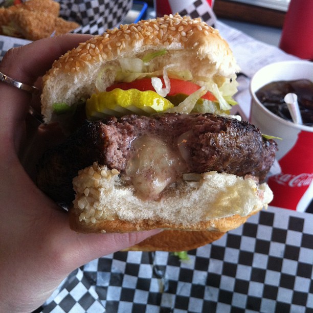 Pickles fried in a cornmeal batter were crispy and juicy, though the “homemade” ranch dressing looked and tasted suspiciously bottled. The fries were good though not noteworthy (we’d actually ordered the highly recommended onion rings, but didn’t mention their mistake for fear of having the whole order whisked away). Dave had the Westhampton Burger (bacon, cheddar, and BBQ sauce) which he enjoyed but made a point of saying was not really worth the wait. I had the Juicy Lucy (“patty stuffed with American Cheese served molten hot”) which was fantastic. It was huge, and seemed like two burgers molded around a golf ball of cheese. As hungry as I was after the wait, I stopped a few bites short of finishing.
