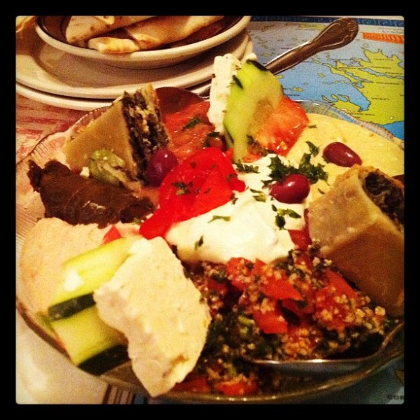 We started with the Sampler Plate – mediocre spinach pie, passable dolmas, but fantastic hummus, tzatziki, feta, eggplant salad, and tabouleh. The star was the taramosalata, caviar blended with bread and spices. Smooth, salty, and a lovely shade of pink. I washed that down with a nice glass of Chardonnay (made even more agreeable by its $5 price tag) and started on my Gyro with fries and ubiquitous Greek Salad. The Gyro was great, not over-sized but still plentiful, and a good ratio of meat to sauce. The pita was particularly good, the Greek version of an english muffin on the griddle – soft and warm with a sheen of seared butter on the oustide.