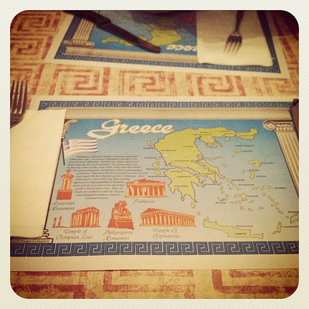 Much like Zoro, when Guy Fieri visits a Diner, Drive In, or Dive, he leaves his mark. Unfortunately, Guy’s mark is a life-sized photo featuring his spiky blonde tips and sunglasses. At least Greek Corner has the good sense to hide it in the back, across from a painting of the Aegean Sea (startlingly blue) and rows of small, polished Mandolins.