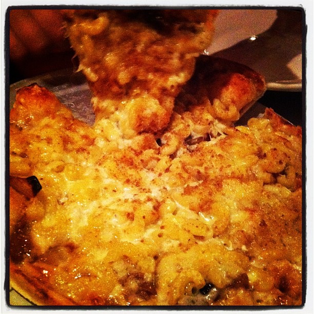 But on to the food. Za makes a big deal about its composed salads, but the Butternut Squash special tasted as if it had been infused with smoke, or some chemical. Maybe the composing mold wasn’t properly rinsed? Fortunately the Avocado Salad was great, but would have been better as a guacamole. The pizza with shiitake mushrooms and truffle oil was good, though in need of salt. The basic pizzas were fine, but not notable. However, the Mac and Cheese Pizza is definitely a reason to brave the trying yet pleasant atmosphere at Za. Noodles on pizza dough is not usually the kind of thing you can perfect at home, and it is pretty unique.