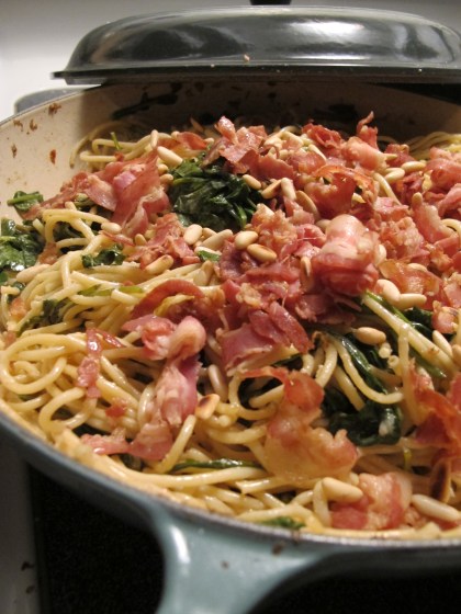 -This recipe calls for pine nuts, which are ridiculously expensive. I substituted slivered almonds, which you can find in the bulk bins at your grocery store – this saves you money because you can buy only what you need, plus almonds are just a lot cheaper. (Don’t use whole almonds, you don’t want big chunks of nuts in this, just a bit here and there). You could omit the nuts altogether, but they do provide a nice texture balance.