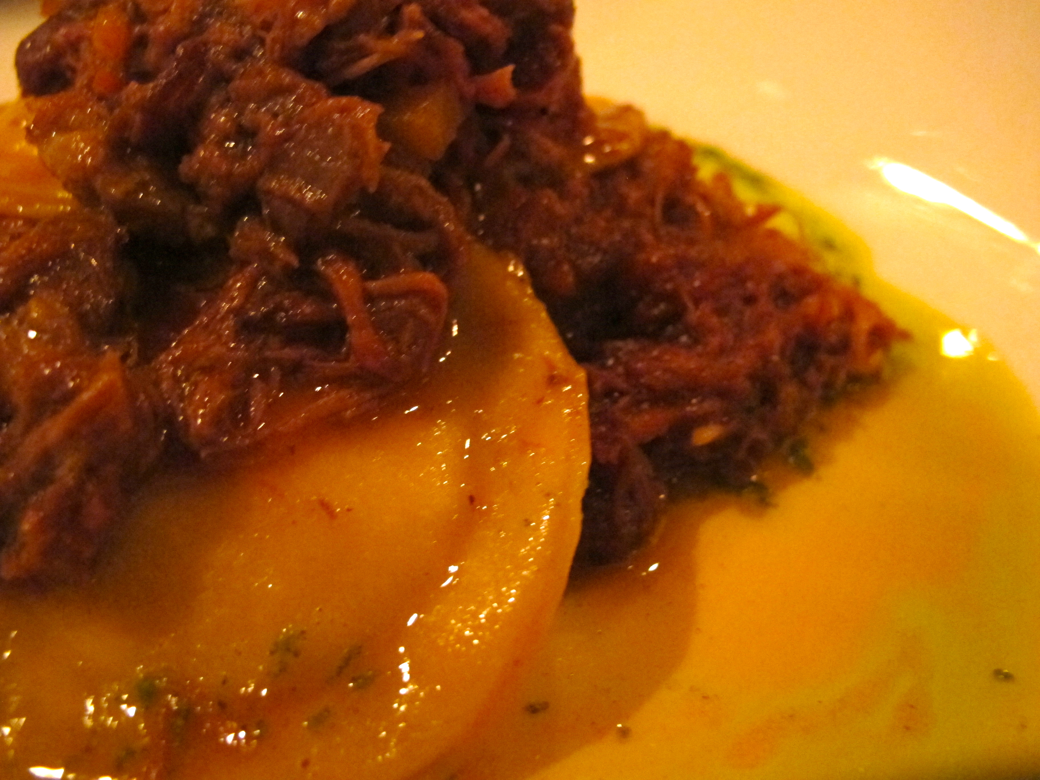 The grilled romaine salad was great, as was the goat cheese crepe and ravioli with lamb ragu. The corn soup was fantastic, pureed without cream. The half portions of the short ribs and steak were expertly prepared (and could have been full portions), and the prosciutto wrapped asparagus was one diner’s favorite plate of the night. My favorite, however, was the yellowtail sashimi, and not just because an extremely generous portion was only $12. The fish was high quality, served with avocado puree and jalapeño pepper slices.