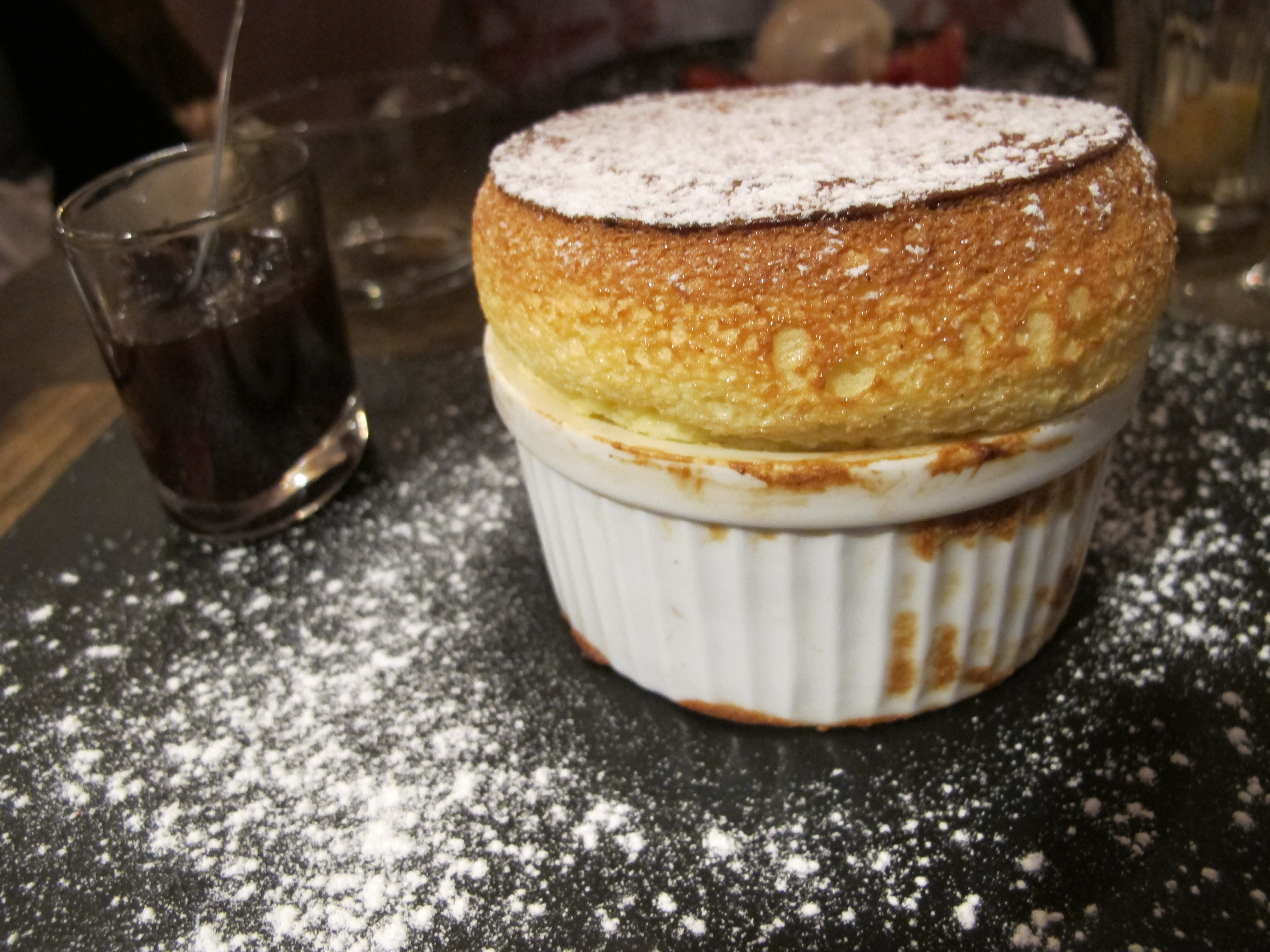 The pea soup with bacon bits and almond slivers is served cold, in an enormous tureen. Get it, just so you can be the person with the tureen. If they have the cod with eggplant puree and chorizo (below), don’t hesitate. The French are quite adept at making what could have been a healthy meal into an artery clogging feast, so while it is fish, it’s not exactly light. And when it comes to dessert, the vanilla souffle with cherries was one of the best desserts of the entire trip. The 15th arr. is a bit off the beaten path, but for a true Paris experience, it’s worth the trek.