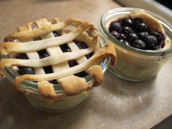A few months ago, my mom got me the book “Cutie Pies,” featuring all types of mini pies, some hand held, some made in short little mason jars. I finally got around to buying some little jars last week, and I’m proud to say that the results of my efforts were NOT a baking fail. I will admit that I bought ready made pie crust, which a) cut down on time and b) meant it tasted good. These pies were really easy – they’d be fun for someone who was throwing Thanksgiving for the first time, or for just a weekday dessert. The recipe below is adapted from the book, with my shortcuts. The book does give a great recipe for crust, as well as a crumb topping.